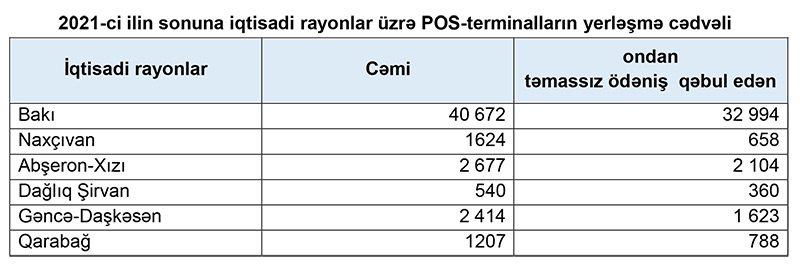 Təsərrüfat subyektlərində 2021-ci il ərzində POS-terminal vasitəsilə aparılan nağdsız əməliyyatların sayı 2020-ci il ilə müqayisədə 2.2 dəfə artaraq 105 mln. ədəd, həcmi isə 80% artaraq 3.9 mlrd. manat olmuşdur. O cümlədən, 2021-ci il ərzində POS-terminallarla aparılan təmassız ödənişlərin sayı 2020-ci il ilə müqayisədə 3.8 dəfə artaraq 71.8 mln. ədəd, həcmi isə 5.2 dəfə artaraq 2.6 mlrd. manat olmuşdur.