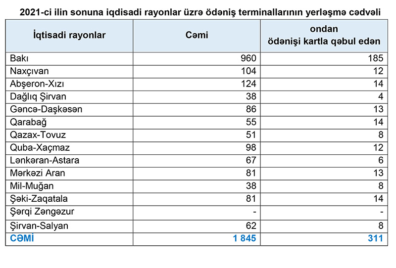 2021-ci ilin sonuna banklar tərəfindən quraşdırılmış ödəniş terminallarının sayı 2020-ci ilin sonu ilə müqayisədə 4.3% azalaraq 1845 ədəd təşkil etmişdir.