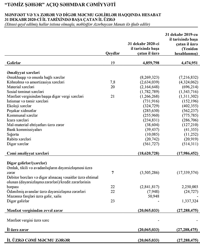 2020-ci ildə "Təmiz Şəhər"in əməliyyat gəlirləri 4,86 milyon manat (2019-cu ilə nisbətən 8,6% çox), əməliyyat xərcləri 18,621 milyon manat (3,5% çox), əmlak, tikili və avadanlıqların dəyərsizləşməsi üzrə zərəri 3,505 milyon manat (4,9 dəfə az), maliyyə aktivləri, debitor borcları və digər alınacaq vəsaitlər üzrə ehtimal olunan kredit zərərlərinin bərpası üzrə zərəri 2,842 milyon manat (əvvəlki il gəlir olub), ödənilmiş avanslar üzrə dəyərsizləşmə zərəri 8 min manat (3,1 dəfə az), məzənnə fərqindən gəliri isə 51 min manat (əvvəlki il olmayıb) təşkil edib.