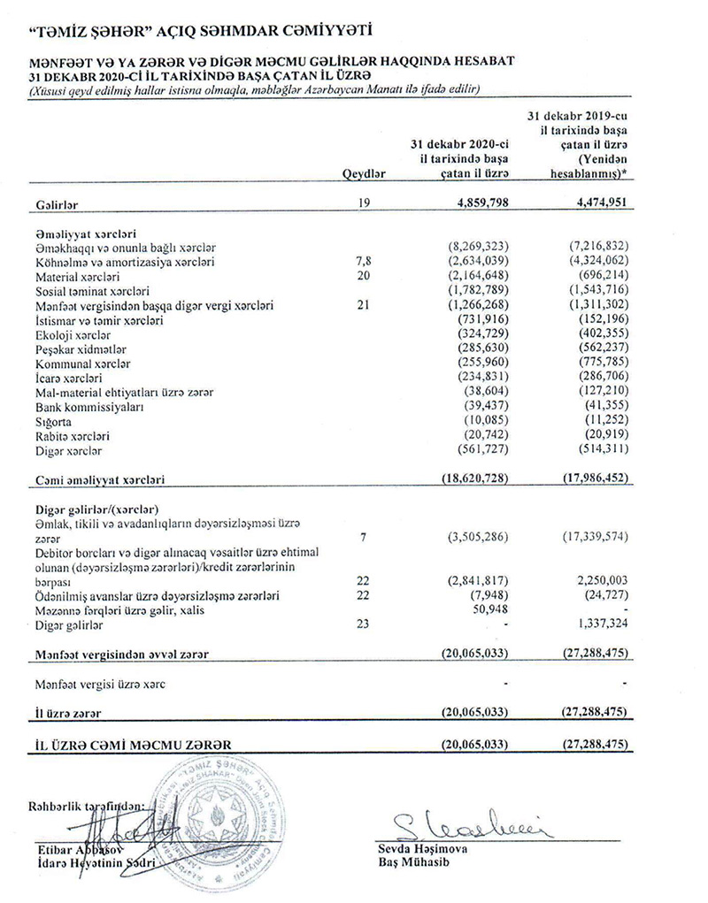 İqtisadiyyat Nazirliyinə məxsus "Təmiz Şəhər" ASC 2020-ci ili 20,065 milyon manat zərərlə başa vurub.