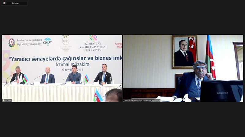 Tədbirə onlayn formatda qoşulan Əqli Mülkiyyət Agentliyinin İdarə Heyətinin sədri Kamran İmanov təqdimatında Agentliyin müvafiq sahədə fəaliyyəti barədə məlumat verib, əqli mülkiyyət və kreativlik anlayışlarının sıx təmasda olduğunu, kreativ sənayenin və müəlliflik hüququna əsaslanan sahələrin ÜDM-də payının artdığını diqqətə çatdırıb.