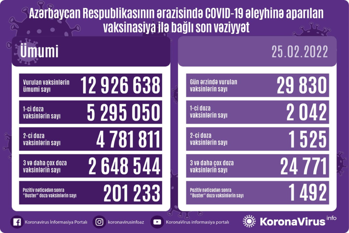 Azərbaycanda son sutkada koronavirus (COVID-19) əleyhinə 29 830 vaksin vurulub. Bir gündə birinci mərhələ üzrə vaksinasiya olunanların sayı 2042, ikinci mərhələ üzrə vaksinasiya olunanların sayı 1525, üç və daha çox doza vaksin vurduranların sayı 24 771, pozitiv nəticədən sonra buster doza üzrə vaksinasiya olunanların sayı isə 1492 nəfərdir.