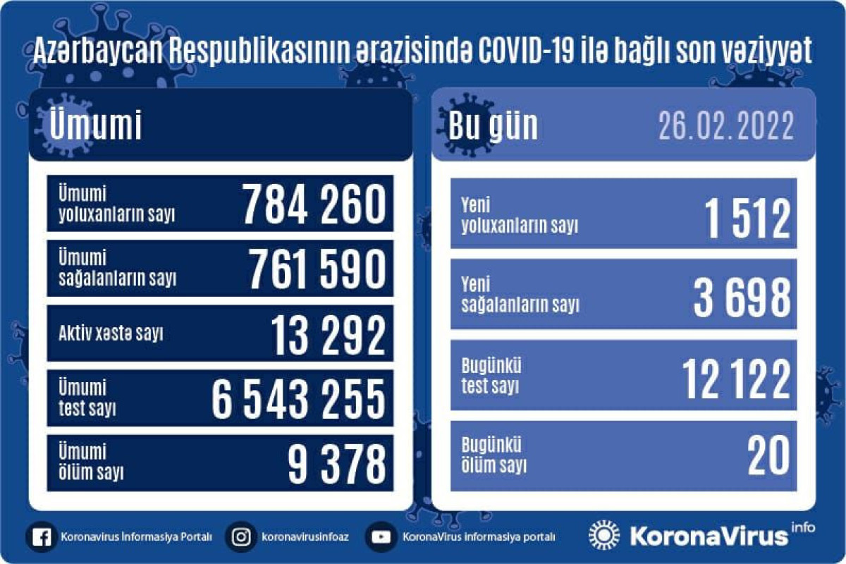 Azərbaycan Respublikasında koronavirus (COVID-19) infeksiyasına 1512 yeni yoluxma faktı qeydə alınıb, 3698 nəfər müalicə olunaraq sağalıb.