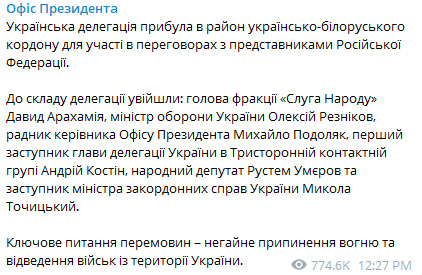 "Ukrayna nümayəndə heyəti Rusiya Federasiyasının nümayəndələri ilə danışıqlarda iştirak etmək üçün Ukrayna-Belarus sərhədi ərazisinə gəlib", - bu barədə Ukrayna Prezident Aparatı məlumat yayıb.