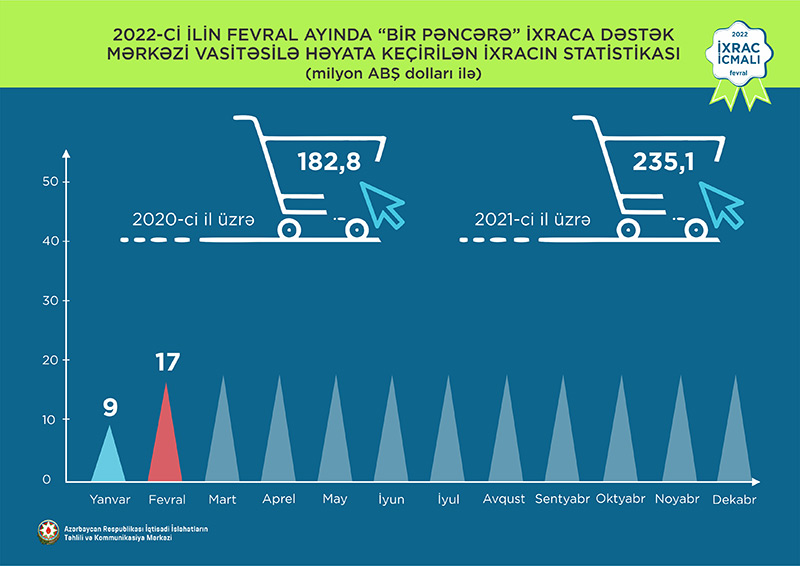 Normallaşma prosesinin davam etdiyi dövrdə 2022-ci ilin yanvar ayı ərzində yeyinti məhsulları üzrə ixrac ötən ilin müvafiq ayı ilə müqayisədə 31% artaraq 60,2 milyon ABŞ dolları, qeyri-yeyinti məhsulları üzrə isə 71,9% artaraq 172 milyon ABŞ dolları təşkil edib.