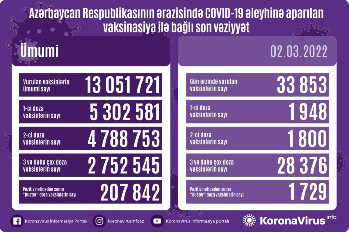 Azərbaycanda son sutkada koronavirus (COVID-19) əleyhinə 33 853 vaksin vurulub.Bir gündə birinci mərhələ üzrə vaksinasiya olunanların sayı 1 948, ikinci mərhələ üzrə vaksinasiya olunanların sayı 1 800, üç və daha çox doza üzrə vaksinasiya olunanların sayı 28 376, pozitiv nəticədən sonra buster doza üzrə vaksinasiya olunanların sayı 1 729 nəfərdir.