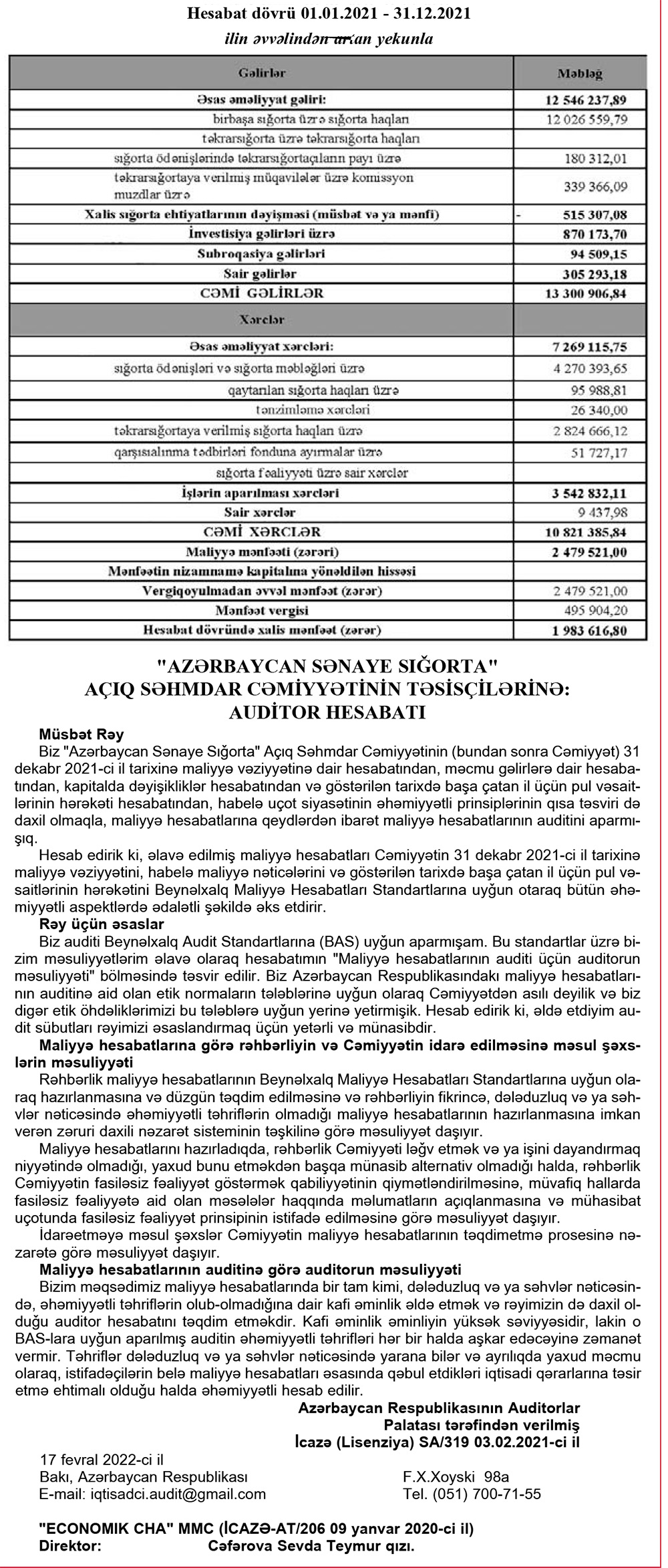 "Azərbaycan Sənaye Sığorta" Açıq Səhmdar Cəmiyyəti 2021-ci ili 1 milyon 984 min manat xalis mənfəət ilə başa vurub. Halbuki, şirkət 2020-ci ili 1 milyon 997 min manat xalis mənfəət ilə bağlamışdı.
