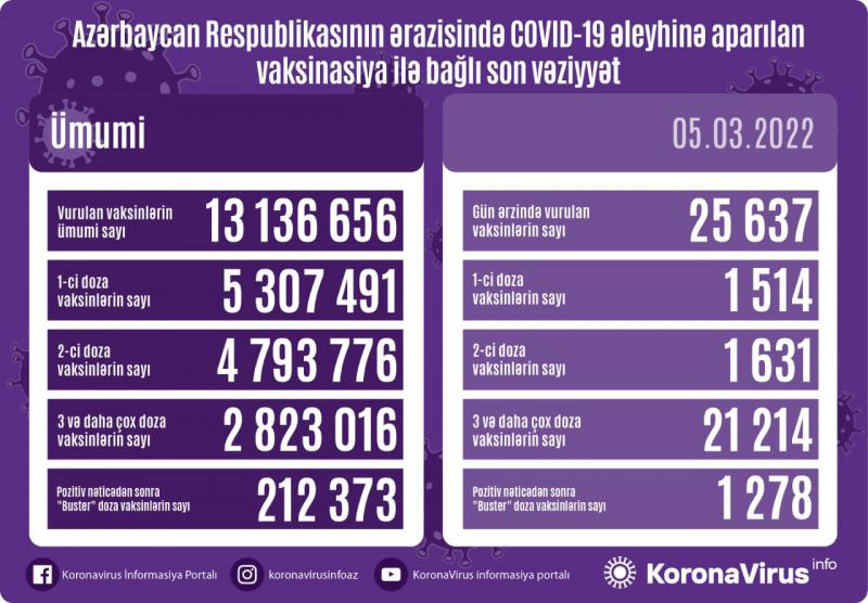 Azərbaycanda son sutkada koronavirus (COVID-19) əleyhinə 25 637 vaksin vurulub. Bir gündə birinci mərhələ üzrə vaksinasiya olunanların sayı 1514, ikinci mərhələ üzrə vaksinasiya olunanların sayı 1631, üç və daha çox doza üzrə vaksinasiya olunanların sayı 21 214, pozitiv nəticədən sonra buster doza üzrə vaksinasiya olunanların sayı 1278 nəfərdir.