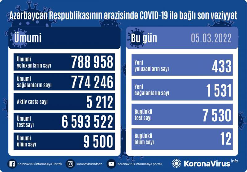 Xatırladaq ki, 04 Mart 2022-ci il tarixində 588 yoluxma faktı və 15 ölüm qeydə alındığı açıqlanmışdı. 09 Fevral 2022-ci il tarixində açıqlanmış fakt (7779) bugünədək qeydə alınmış ən yüksək günlük yoluxma sayıdır.