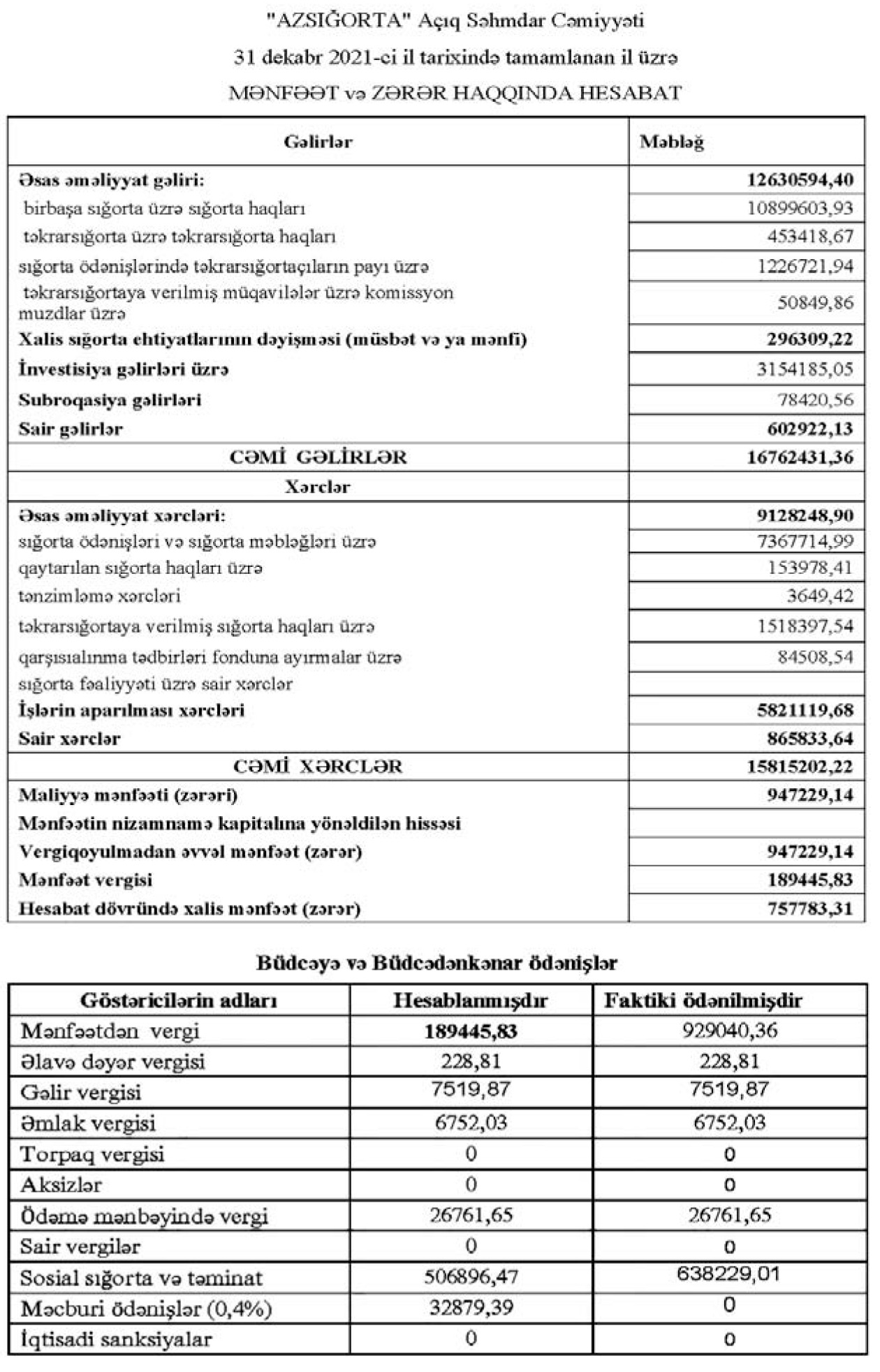 “Azsığorta” ASC-nin 2021-ci ildə xalis mənfəəti 2020-ci illə müqayisədə 2,4 dəfə azalaraq 758 min manat təşkil edib. Şirkət 2020-ci ili 1 milyon 857 min manat manat xalis mənfəət ilə bağlamışdı. Xalis mənfəətin geriləməsi gəlirlərin (əsasən yığımların) azalması və sığorta ödənişlərinin artması ilə əlaqədardır.