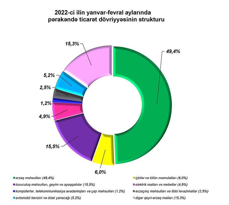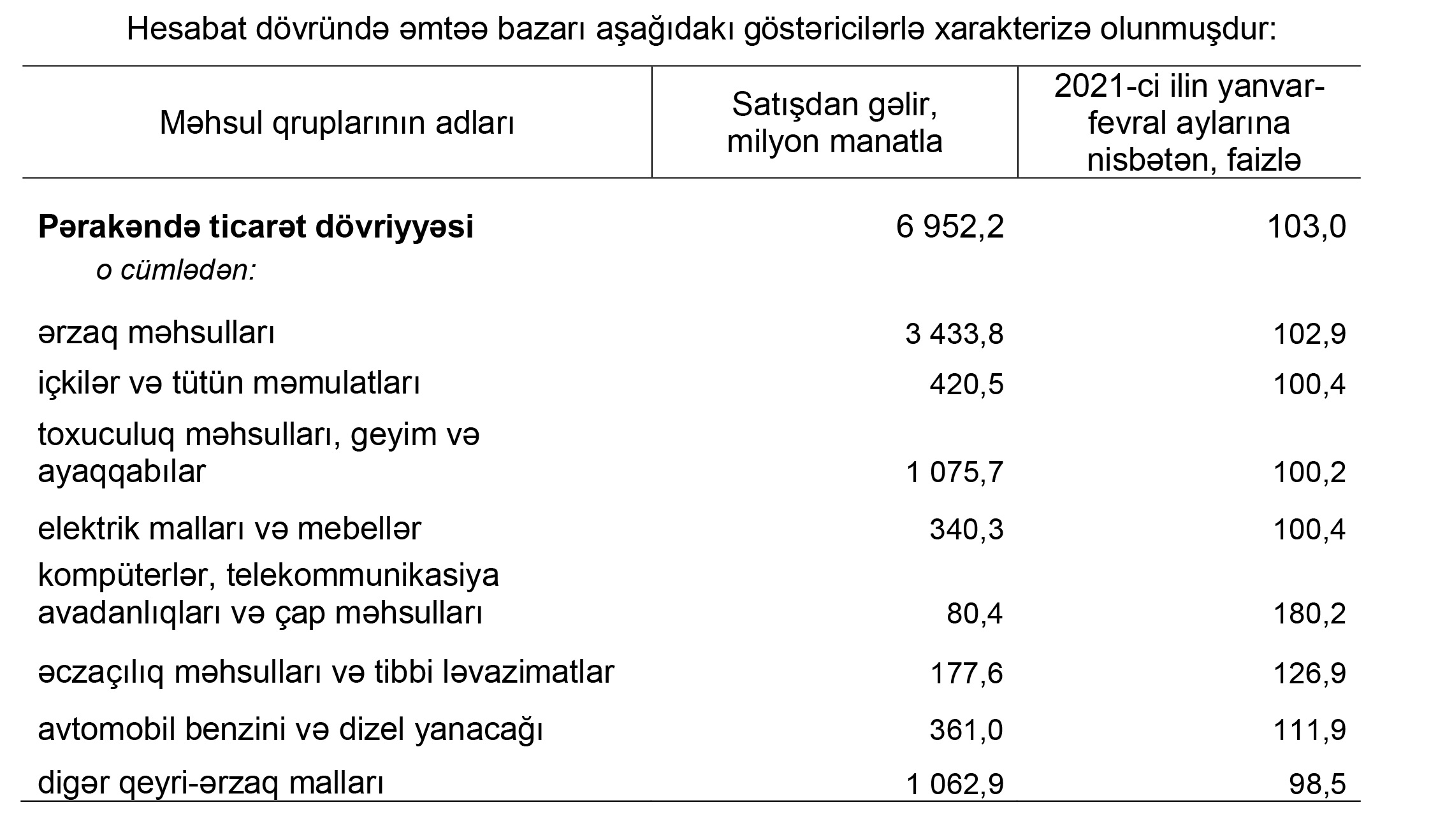 2022-ci ilin yanvar-fevral aylarında pərakəndə ticarət şəbəkəsində istehlakçılara 7 milyard manatlıq, o cümlədən 3,9 milyard manatlıq ərzaq məhsulları, içkilər və tütün məmulatları, 3,1 milyard manatlıq qeyri-ərzaq malları satılmışdır.