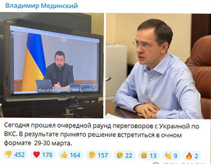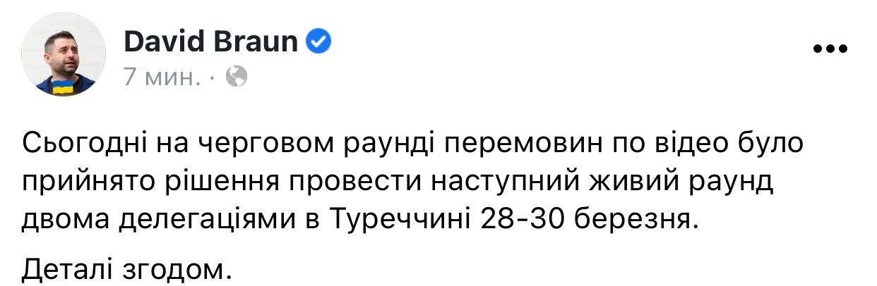 "Bu gün Ukrayna ilə videokonfrans ilə danışıqların növbəti raundu olub. Nəticədə martın 29-30-da şəxsən görüşmək qərara alınıb", - o yazıb.