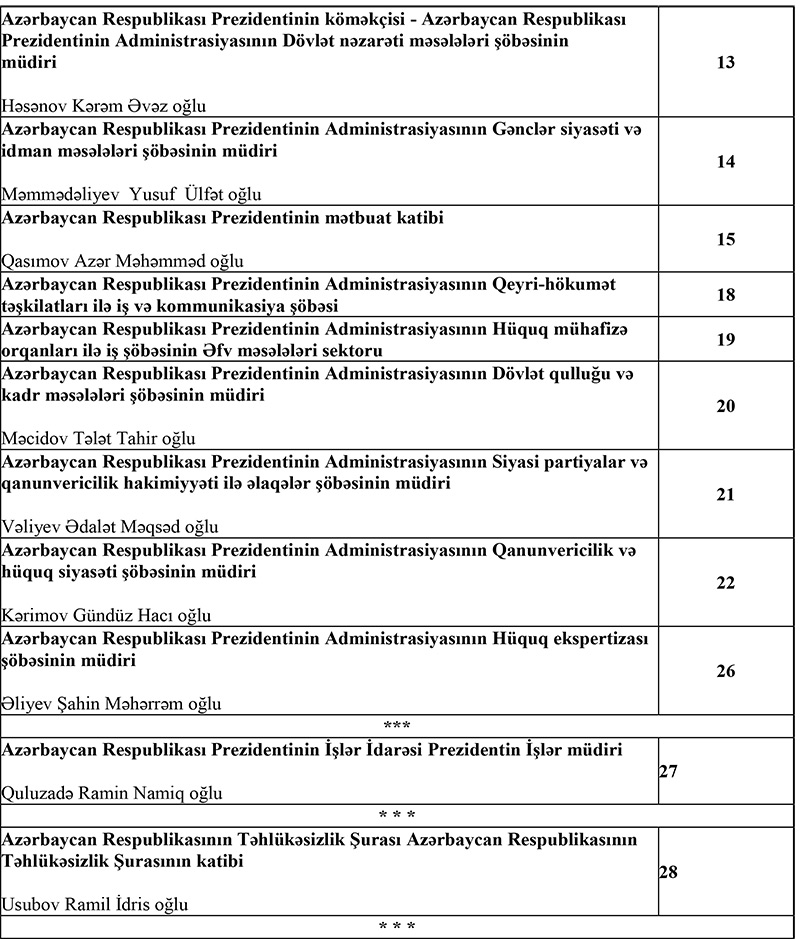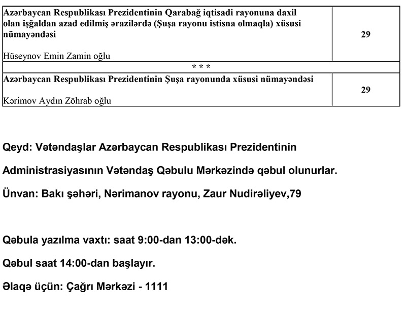 Qeyd: Vətəndaşlar Azərbaycan Respublikası Prezidentinin Administrasiyasının Vətəndaş Qəbulu Mərkəzində qəbul olunurlar.