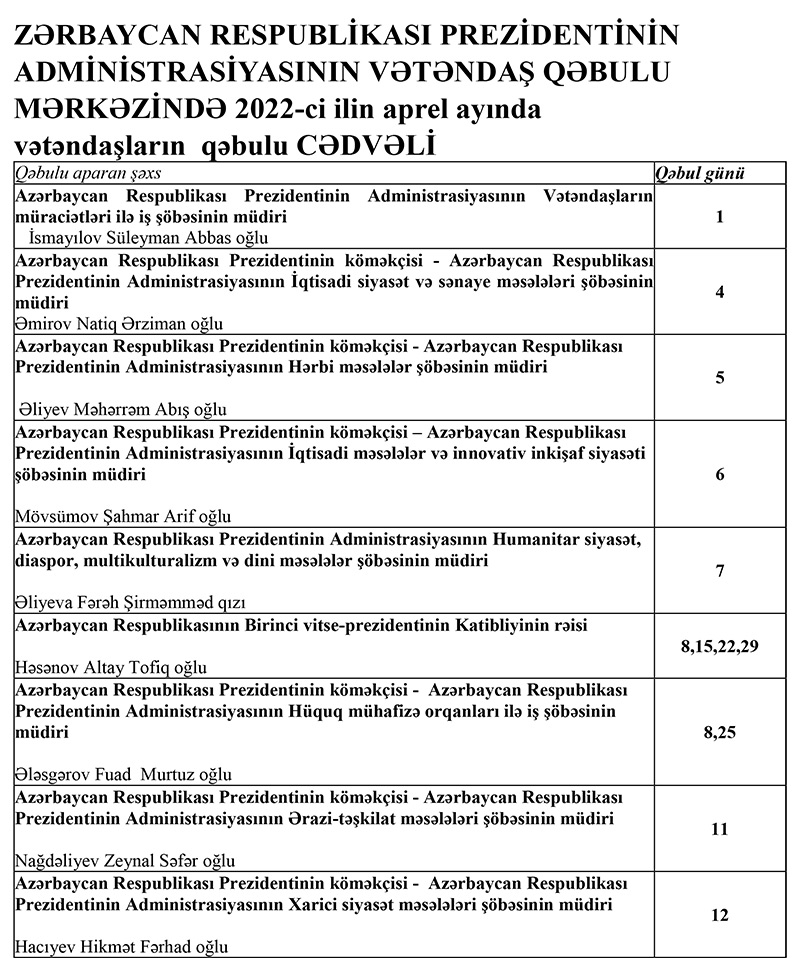 AZƏRBAYCAN RESPUBLİKASI PREZİDENTİNİN ADMİNİSTRASİYASININ VƏTƏNDAŞ QƏBULU MƏRKƏZİNDƏ 2022-ci ilin aprel ayında vətəndaşların qəbulu CƏDVƏLİ