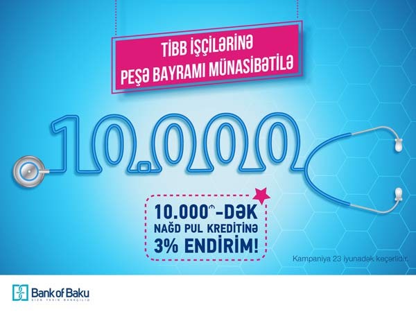 12-23 iyun tarixlərini əhatə edən kampaniya çərçivəsində tibb sahəsində və səhiyyə müəssisələrində çalışan şəxslər Bank of Baku-dan 10.000 AZN-dək Nağd Pul kreditini aşağıdakı güzəştli şərtlərlə əldə edə biləcəklər: