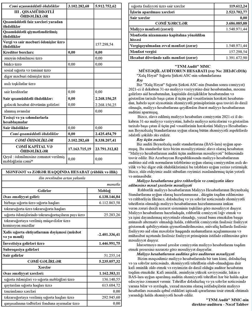 “Xalq Həyat Sığorta” ASC 2021-ci ili 1 milyon 392 min manat xalis mənfəət ilə başa vurub.