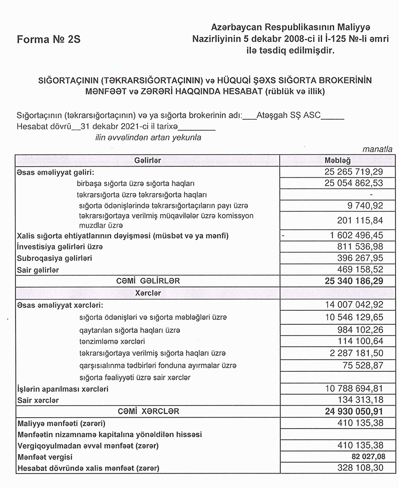 “Atəşgah Sığorta” ASC 2021-ci ili 328 min manat xalis mənfəət ilə başa vurub. Xatırladaq ki, “Atəşgah Sığorta” Şirkəti 2020-ci ili 3 milyon 349 min manat xalis mənfəət ilə bağlamışdı. Beləliklə, 2020-ci illə müqayisədə 2021-ci ildə “Atəşgah Sığorta”nın xalis mənfəəti 10,2 dəfə azalıb.
