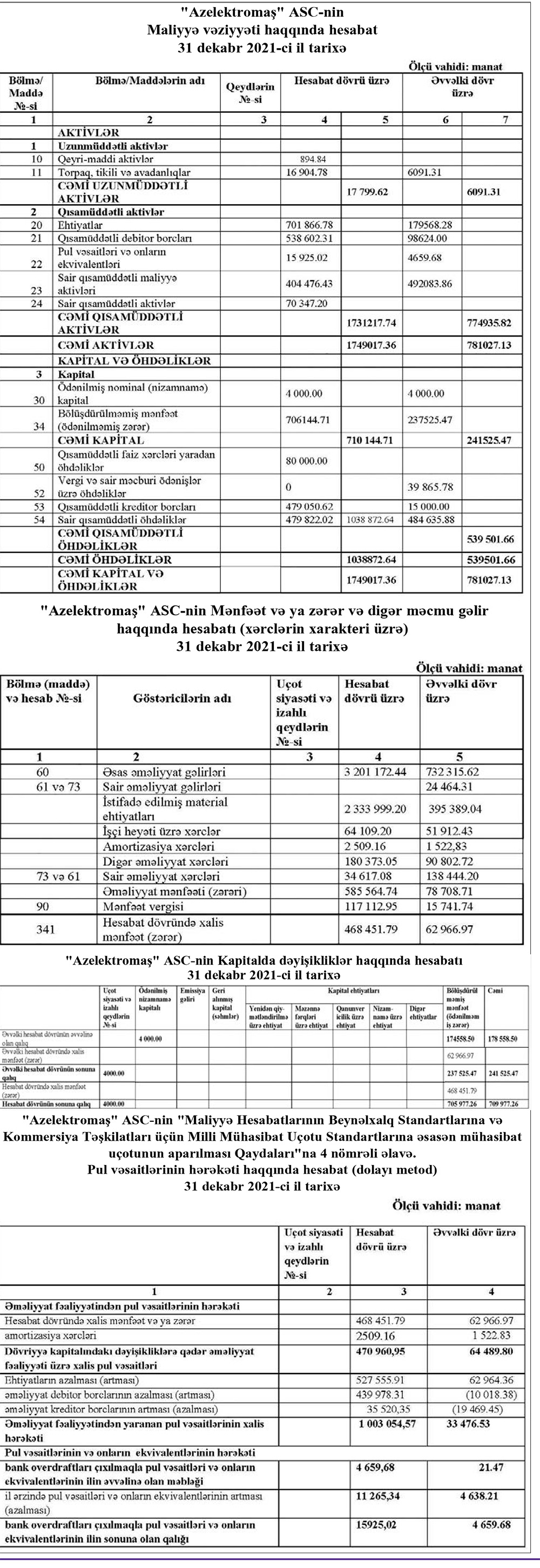 Marja Şirkətin Maliyyə vəziyyəti haqqında 31 dekabr 2021-ci il tarixinə olan hesabatlarına istinadən xəbər verir ki, 2020-ci illə müqayisədə 2021-ci ildə şirkətin xalis mənfəəti 7,4 dəfə artıb. “Azelektromaş” 2020-ci ili 63 min manat xalis mənfəət ilə bağlamışdı.