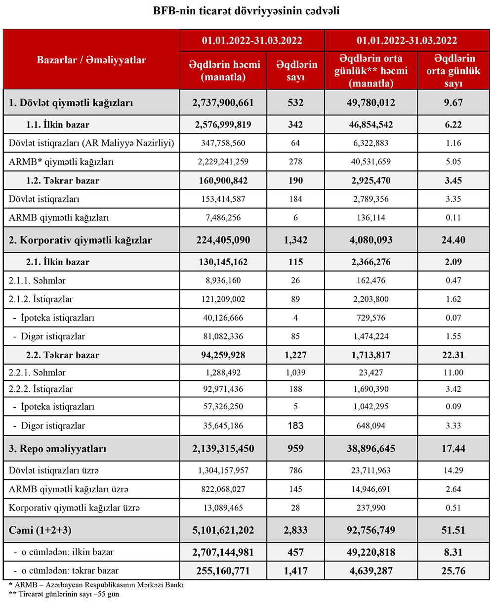 Bakı Fond Birjasında 01.01.2022-31.03.2022 tarixləri ərzində qiymətli kağızlar üzrə keçirilən əməliyyatların ümumi həcmi 5 milyard 101 milyon 621 min manat təşkil edib.