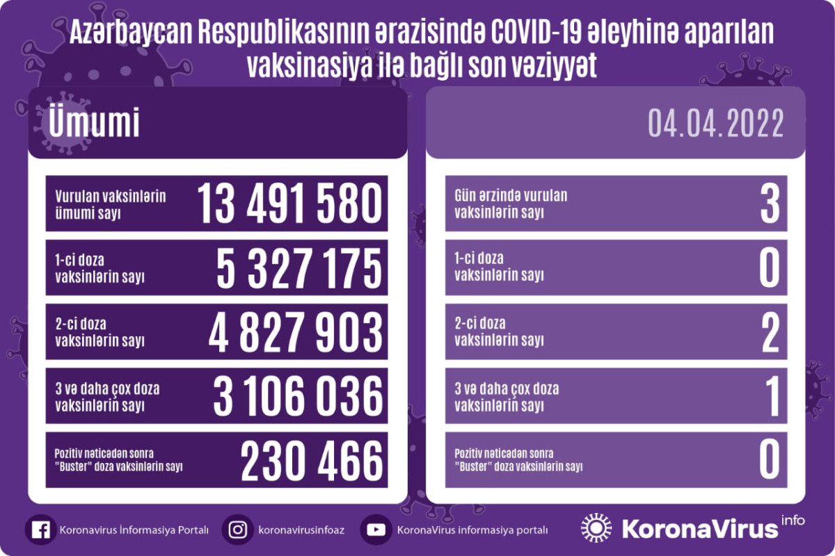 Azərbaycanda son sutkada koronavirus (COVID-19) əleyhinə 3 vaksin vurulub. Bir gündə birinci mərhələ üzrə vaksinasiya olunanların sayı 0, ikinci mərhələ üzrə vaksinasiya olunanların sayı 2, üç və daha çox doza vaksin vurduranların sayı 1, pozitiv nəticədən sonra buster doza üzrə vaksinasiya olunanların sayı isə 0 nəfərdir.