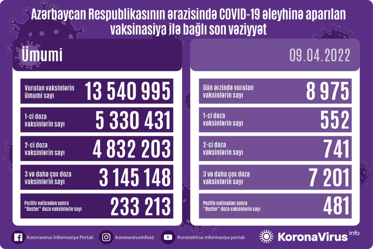 Azərbaycanda son sutkada koronavirus (COVID-19) əleyhinə 8975 vaksin vurulub. Bir gündə birinci mərhələ üzrə vaksinasiya olunanların sayı 552, ikinci mərhələ üzrə vaksinasiya olunanların sayı 741, üç və daha çox doza vaksin vurduranların sayı 7201, pozitiv nəticədən sonra buster doza üzrə vaksinasiya olunanların sayı isə 481 nəfərdir.