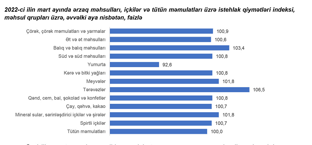 2022-ci ilin mart ayında ərzaq məhsulları, içkilər və tütün məmulatları üzrə istehlak qiymətləri indeksi əvvəlki aya nisbətən 1,5 faiz, əvvəlki ilin mart ayına nisbətən 16,8 faiz artıb.