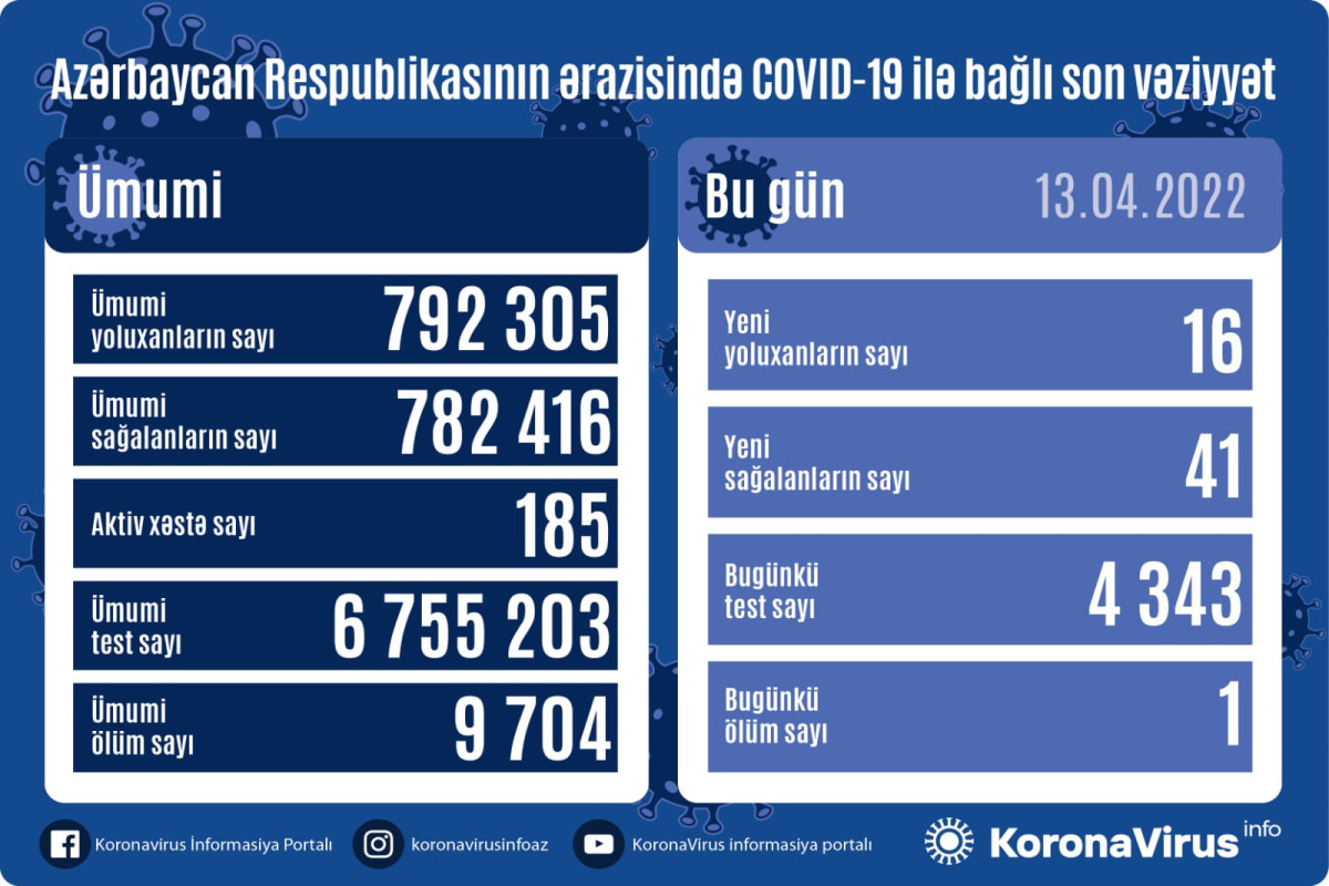 Azərbaycanda koronavirus (COVID-19) infeksiyasına 16 yeni yoluxma faktı qeydə alınıb, 41 nəfər müalicə olunaraq sağalıb.