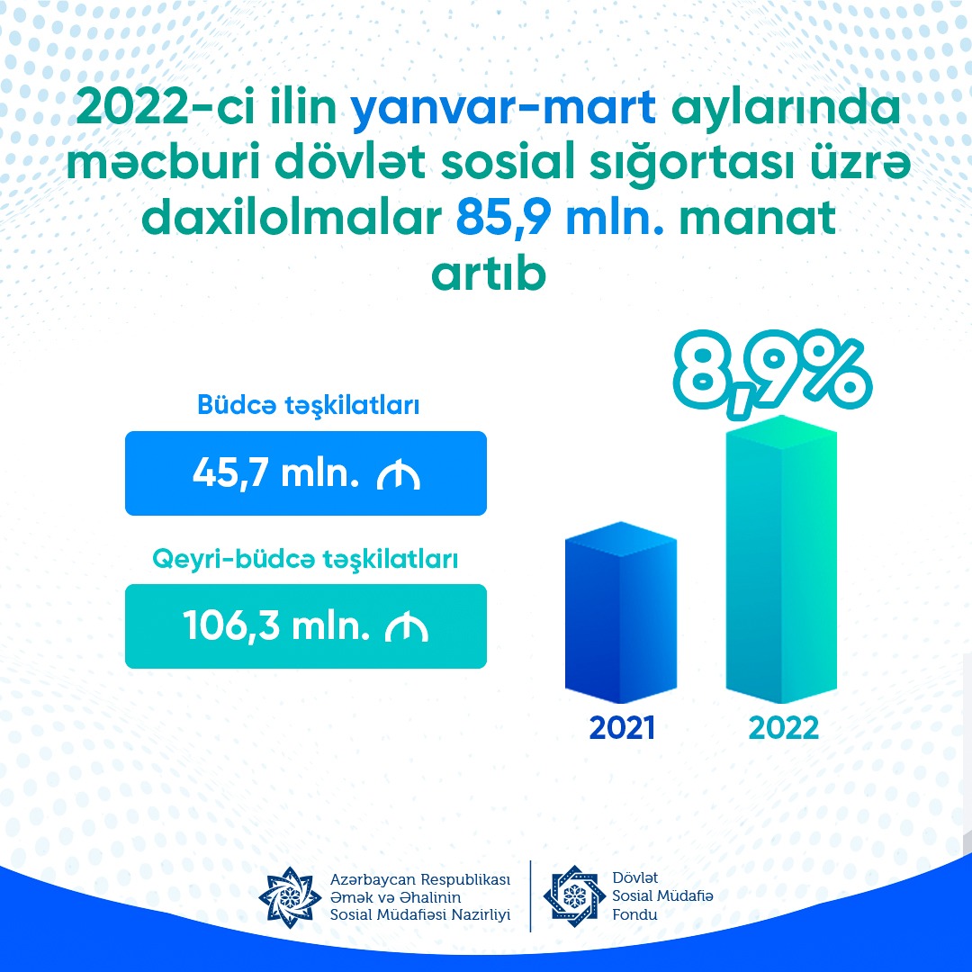 2022-ci ilin üç ayı ərzində məcburi dövlət sosial sığorta haqları üzrə daxilolmalarda proqnoza nisbətdə 85,9 mln. manat və ya 8,9% artım qeydə alınıb.