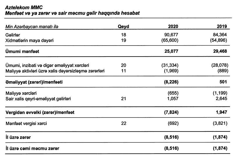 “Aztelekom” MMC-nin 2020-ci il audit edilmiş maliyyə hesabatlarının qısa icmalında bildirilir ki, Cəmiyyətin gəlirləri, əsasən, internet və telefon xidmətləri üzrə formalaşır və 2019-cu illə müqayisədə 2020-ci ilin gəliri 7,5% artaraq 90 milyon 677 min manata çatmışdır. Ümumi gəlirlərdə müşahidə edilən artıma baxmayaraq, Cəmiyyət 2020-ci ili 8 milyon 516 min manat zərərlə başa vurmuşdur. Zərərin formalaşmasına əsas səbəb əmək haqqı üzrə xərclərin və amortizasiya xərclərinin artması olmuşdur. Belə ki, işçilərin sosial rifahının yaxşılaşdırılması, həmçinin pandemiya ilə əlaqədar bəzi işçi heyətinin gücləndirilmiş iş rejiminə keçirilməsi əlavə ödənişlərin yaranmasına və müvafiq xərc maddəsinin müşahidə edilən ildə 14% artmasına gətirib çıxarmışdır. Zərərin formalaşmasına səbəb olan digər xərc maddələrindən amortizasiya xərcindəki artım Azərbaycan Respublikasının milli iqtisadiyyat perspektivi üzrə Starteji Yol Xəritəsinə uyğun olaraq iqtisadiyyatın rəqəmsallaşdırılması üçün İnformasiya Kommunikasiya Texnologiyaları infrastrukturunun təkmilləşdirilməsi istiqamətində Cəmiyyətin kapital qoyuluşları proqramını yerinə yetirməsi ilə əlaqədar olmuşdur. Belə ki, müvafiq proqram çərçivəsində tikintisi və quraşdırılması başa çatmış əsas vəsaitlər istismara verilmiş və bu da öz növbəsində əvvəlki telekommunikasiya sistemləri və avadanlıqların daha tez köhnəlməsinə gətirib çıxarmış, nəticədə amortizasiya xərci 29% artmışdır. Cəmiyyətin əməliyyat fəaliyyəti üzrə xalis pul vəsaitləri 2020-ci il üzrə 12 milyon 429 min manat təşkil etmişdir və bundan əlavə dövlət büdcəsindən regionlarda Universal Telekommunikasiya Xidmətlərinin təmin edilməsi ilə əlaqədar 17 601 min manat məbləğində vəsait ayrılmışdır. (Həmin məbləğ 2019-cu ildə 10 372 min manat olmuşdur). Ümumilikdə Cəmiyyətin 2020-ci ilin sonuna pul vəsaitlərinin vəziyyəti ötən illə müqayisədə xeyli yaxşılaşaraq 621 min manatdan 3 milyon 325 min manata qədər artmışdır.