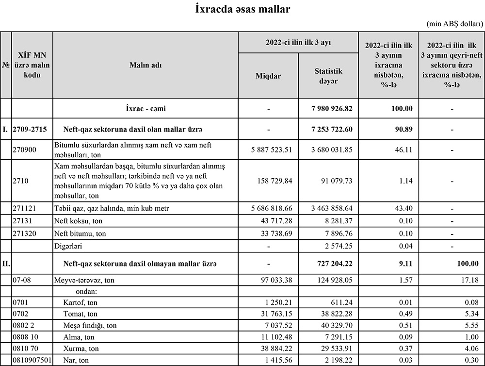 Azərbaycanın ixracının 91%-i neft-qaz sektoruna daxil olan mallar üzrədir.2022-ci ilin yanvar-mart dövründə (1-ci rübdə) Azərbaycanın xarici ticarət əməliyyatlarının həcmi 10 milyard 908 milyon 70 min ABŞ dolları təşkil edib.