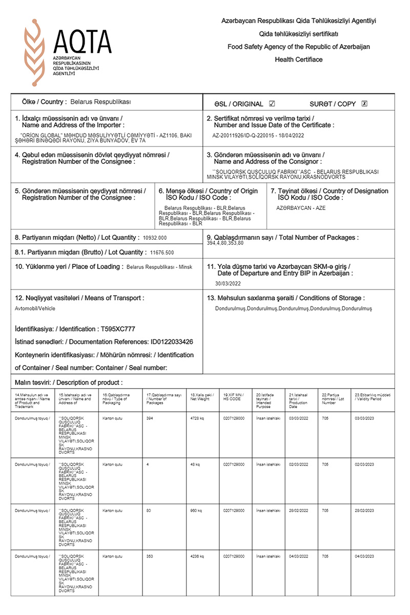 "Bazarstore" məhsulun istehsalına dair sertifikatların, məhsulun AQTA sertifikatlarının surətlərini və məhsulun istehsal ölkəsində qüvvədə olan dövlət standartlarını da təqdim edib.