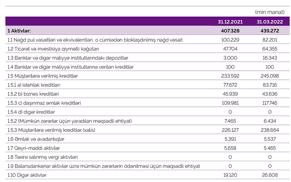 Ümumi gəlirlər 9,6 milyon manat, xərclər 9,4 milyon manat təşkil etmişdir. Birinci rübdə Bank 226,5 min manat həcmində xalis mənfəət əldə edib.