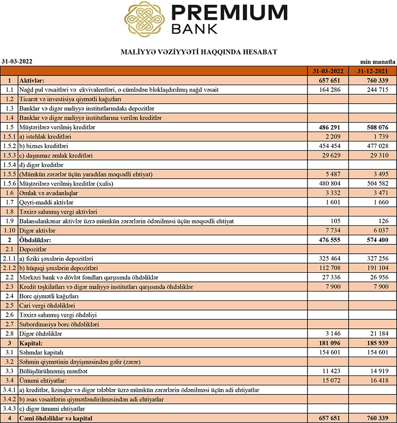 "Premium Bank" ASC 2022-ci ilin 1-ci rübünü 1 milyon 393 min manat xalis mənfəət ilə başa vurub. Halbuki, Bank 2021-ci ilin eyni dövrünü 5 milyon 345 min manat xalis mənfəət ilə bağlamışdı. Beləliklə, "Premium Bank"ın xalis mənfəəti 2021-ci ilin ilk rübü ilə müqayisədə 2022-ci ilin ilk rübündə 3,8 dəfə azalıb. 2021-ci ilin ilk rübündə Bankın xalis mənfəəti mümkün zərərlər üçün yaradılan məqsədli ehtiyatlardan azad olmuş 6 milyon 6 min manatın hesabına formalaşmışdı.