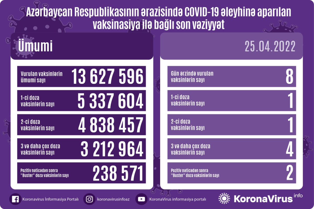 Azərbaycanda son sutkada koronavirus (COVID-19) əleyhinə 8 vaksin vurulub. Bir gündə birinci mərhələ üzrə vaksinasiya olunanların sayı 1, ikinci mərhələ üzrə vaksinasiya olunanların sayı 1, üç və daha çox doza üzrə vaksinasiya olunanların sayı 4, pozitiv nəticədən sonra buster doza üzrə vaksinasiya olunanların sayı 2 nəfərdir.