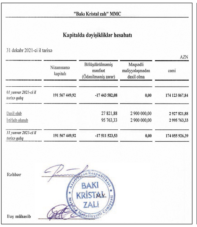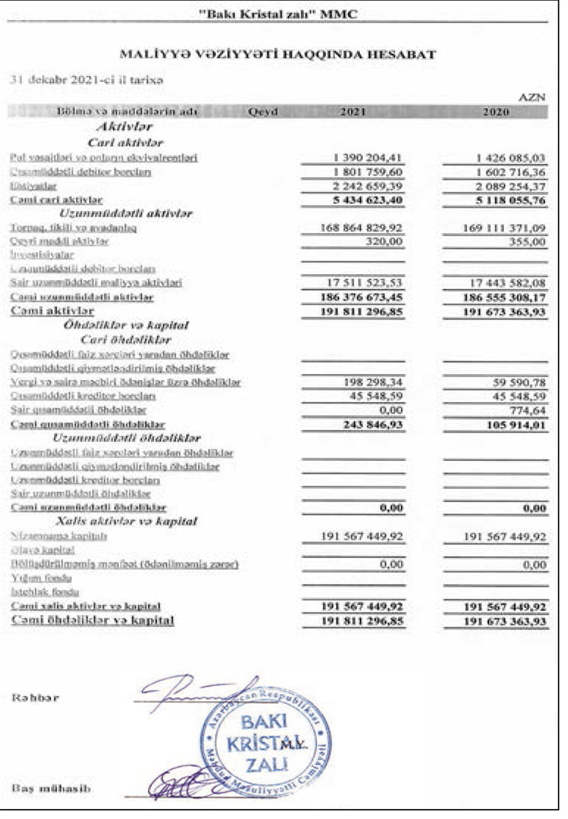 2021-ci ildə "Bakı Kristal Zalı"nın cəmi əməliyyat xərcləri 2 milyon 999 min manat təşkil edib. Ötən il şirkət 36 min 18 manat əməliyyat mənfəətindən 7 min 204 manat mənfəət vergisi də ödəyib.
