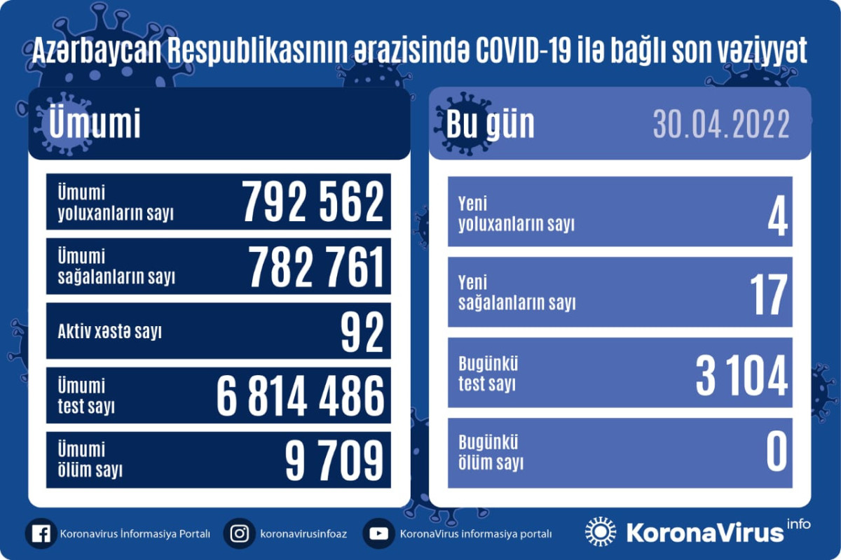 Azərbaycan Respublikasında koronavirus (COVID-19) infeksiyasına 4 yeni yoluxma faktı qeydə alınıb, 17 nəfər müalicə olunaraq sağalıb.