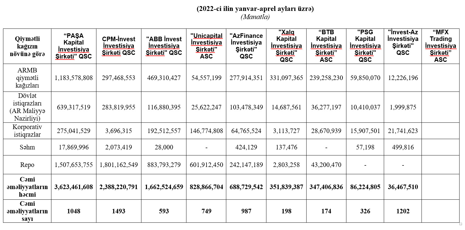 Marja.az Birja-ya istinadən xəbər verir ki, 2022-ci ilin yanvar-aprel ayları üzrə 1-ci yeri “PAŞA Kapital İnvestisiya Şirkəti” QSC, 2-ci yeri "CPM-İnvest İnvestisiya Şirkəti" QSC, 3-cü yeri isə "ABB İnvest İnvestisiya Şirkəti" QSC tutub.