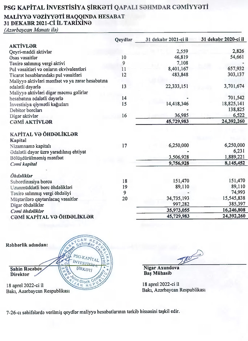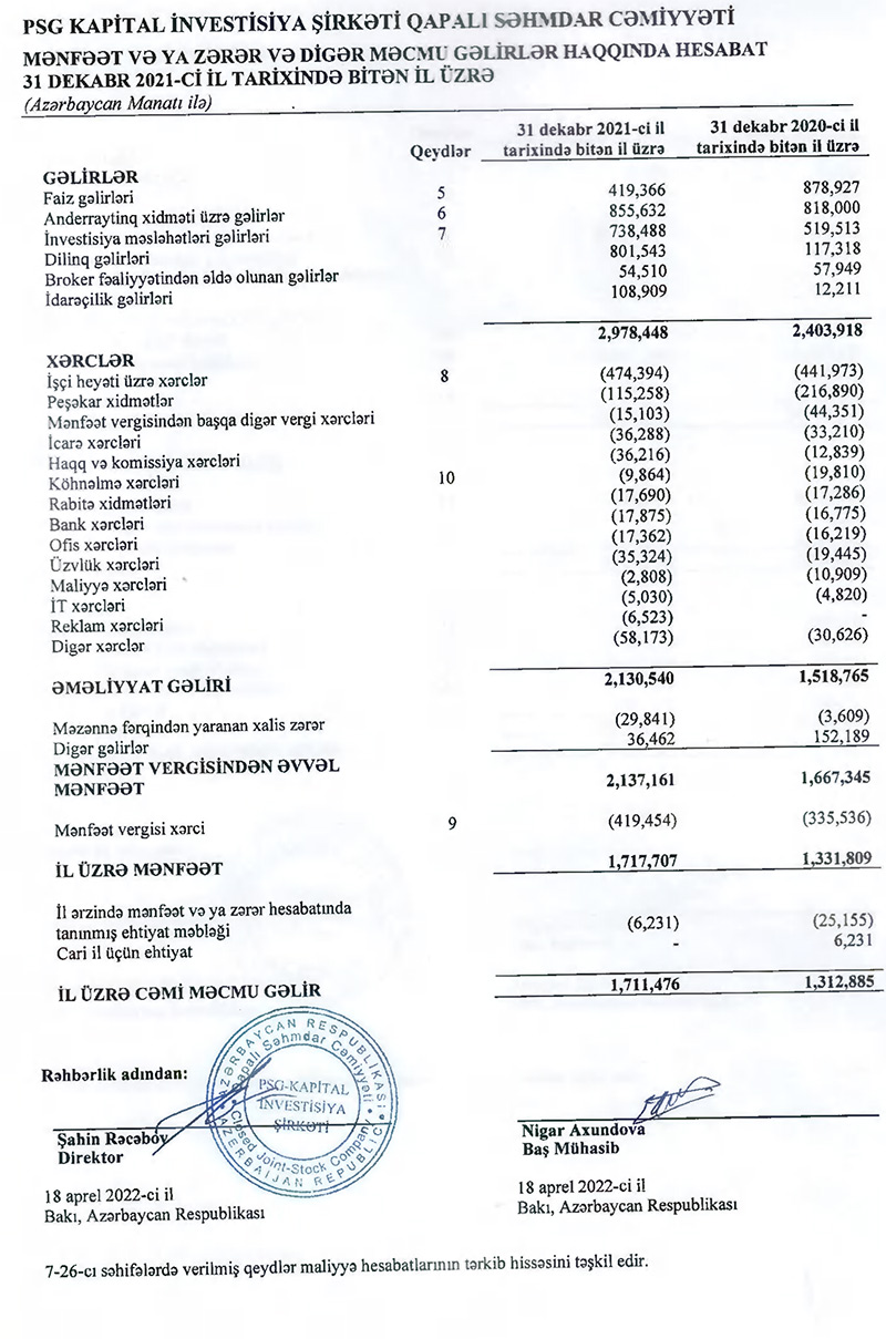 Mara.az xəbər verir ki, "PSG-Kapital İnvestisiya Şirkəti"nin cəmi gəlirləri 2020-ci ildə 2 milyon 404 min manat ikən, 2021-ci ildə 2 milyon 978 min manat təşkil edib (574 min manat və ya 23,9% artıb).