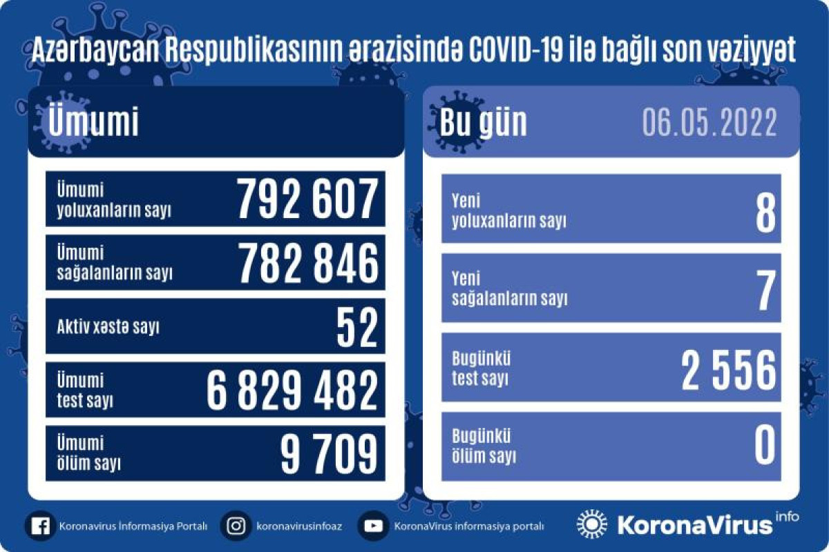 Azərbaycan Respublikasında koronavirus (COVID-19) infeksiyasına 8 yeni yoluxma faktı qeydə alınıb, 7 nəfər müalicə olunaraq sağalıb.