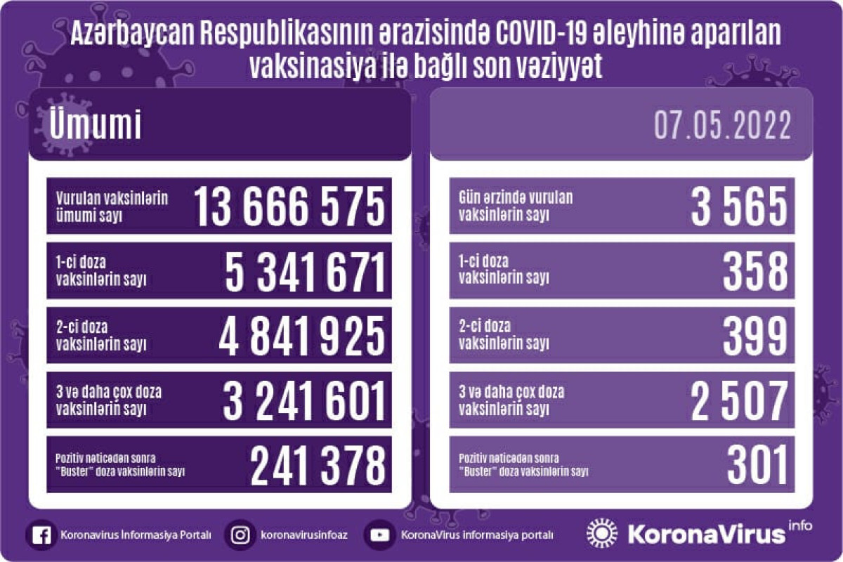 Azərbaycanda son sutkada koronavirus (COVID-19) əleyhinə 3 565 vaksin vurulub. Bir gündə birinci mərhələ üzrə vaksinasiya olunanların sayı 358, ikinci mərhələ üzrə vaksinasiya olunanların sayı 399, üç və daha çox doza üzrə vaksinasiya olunanların sayı 2 507, pozitiv nəticədən sonra buster doza üzrə vaksinasiya olunanların sayı 301 nəfərdir.