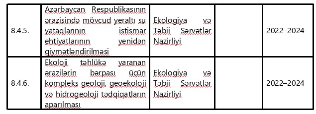 Ekologiya və Təbii Sərvətlər 2022– 2024-cü illərdə AMEA ilə birlikdə Nazirliyi Şərqi Zəngəzur və Qarabağ iqtisadi rayonlarının geoloji quruluşu (stratiqrafiya, tektonika, maqmatizm, hidrogeologiya) və faydalı qazıntıları üzrə toplu məlumatlar bazasının yaradılmasını təmin etməlidir.