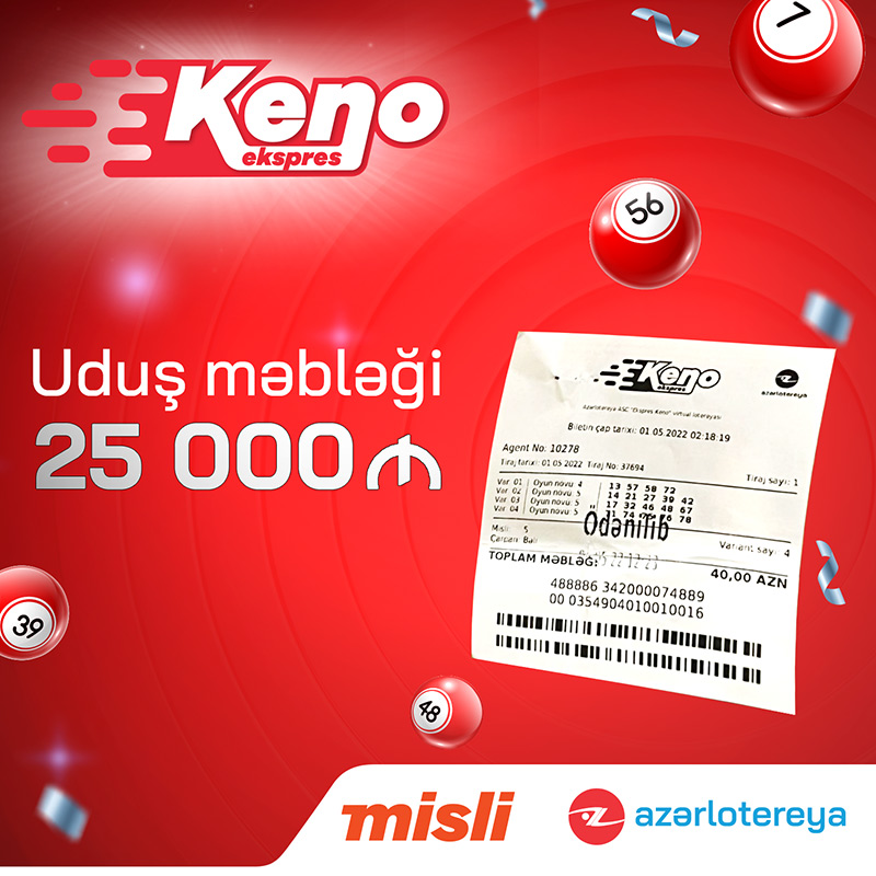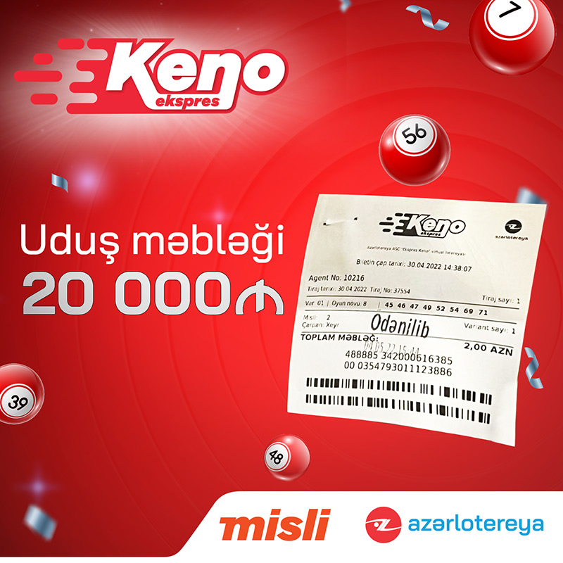 “Ekpres Keno” hər beş dəqiqə ərzində bir milyon manat qazanmaq imkanı verin unikal virtual lotereyadır. Lotereya həvəskarları paytaxtda və regionlarda fəaliyyət göstərən “Misli” məntəqələrinə yaxınlaşaraq həm şanslarını sınaya, həm də vaxtlarını əyləncəli keçirə bilərlər.