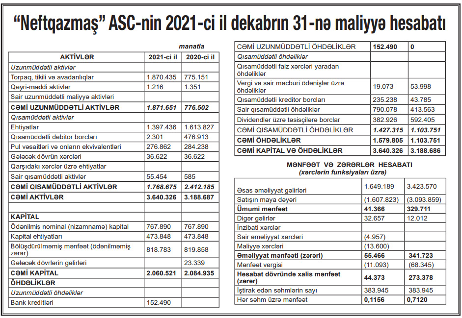 “Neftqazmaş” ASC 2021-ci ili 44 min 373 manat xalis mənfəət ilə başa vurub. Halbuki, şirkət 2020-ci ili 273 min 378 manat xalis mənfəət ilə bağlamışdı. Beləliklə,“Neftqazmaş”ın xalis mənfəəti 2020-c illə müqayisədə 2021-ci ildə 6,2 dəfə azalıb.