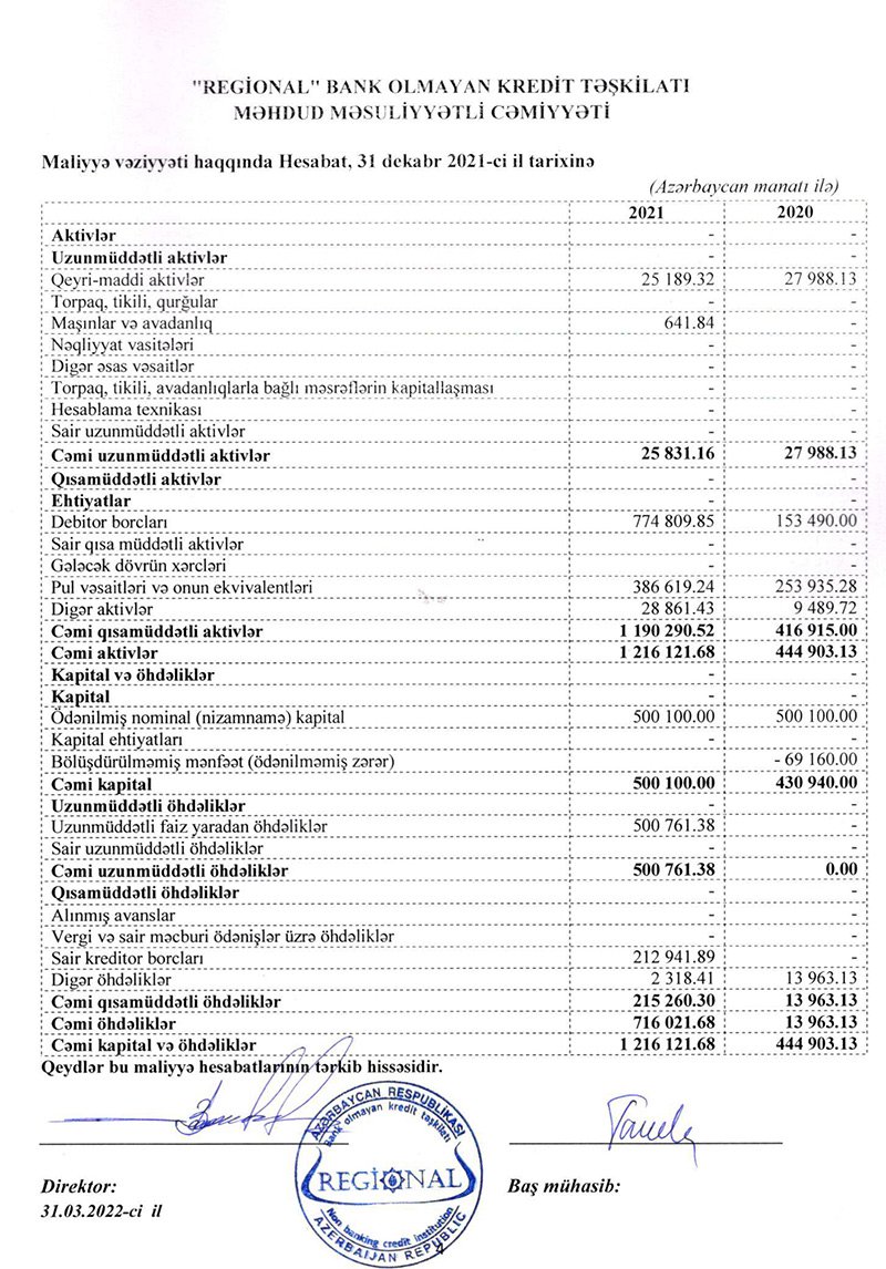 31 Dekabr 2021-ci il tarixində “Regional” BOKT-un kredit portfeli 775 min manat təşkil edib. Təşkilat 2020-ci ilin sonunda 153 min manat kredit portfelinə malik idi.