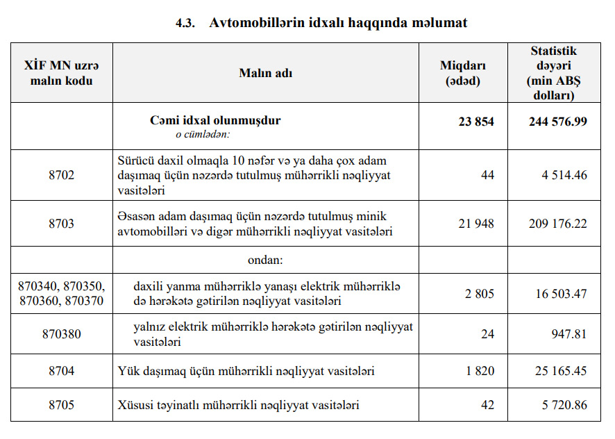 2022-ci ilin ilk 4 ayında Azərbaycana 4 min156 ədəd daxili yanma mühərriklə yanaşı elektrik mühərriklə də hərəkətə gətirilən nəqliyyat vasitələri və 92 ədəd yalnız elektrik mühərriklə hərəkətə gətirilən nəqliyyat vasitələri idxal edilib.