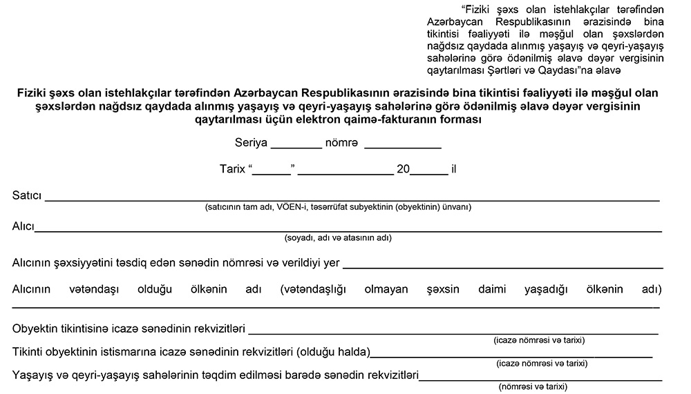 Fiziki şəxs olan istehlakçılar (əhali) tərəfindən Azərbaycan ərazisində bina tikintisi fəaliyyəti ilə məşğul olan şəxslərdən nağdsız qaydada alınmış yaşayış və qeyri-yaşayış sahələrinə görə ödənilmiş əlavə dəyər vergisinin 30%-i alıcıya qaytarılacaq.