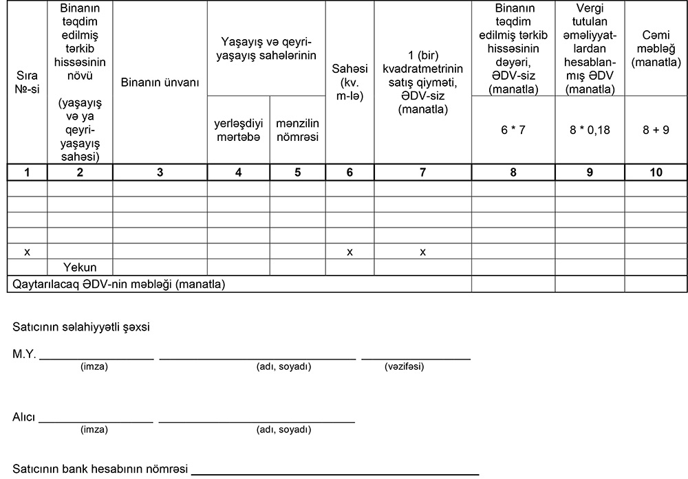 Yaşayış və qeyri-yaşayış sahələrinə görə ödənilmiş əlavə dəyər vergisi həmin sahələrin tam dəyəri (ƏDV daxil olmaqla) nağdsız qaydada (alıcının bank hesabından satıcının bank hesabına ödəmə tapşırığı əsasında köçürmə yolu ilə və ya alıcı tərəfindən birbaşa nağd qaydada satıcının bank hesabına köçürülməklə) satıcının bank hesabına ödənildikdə və ƏDV məbləği satıcının ƏDV-nin depozit hesabına ödənildikdə qaytarılır.