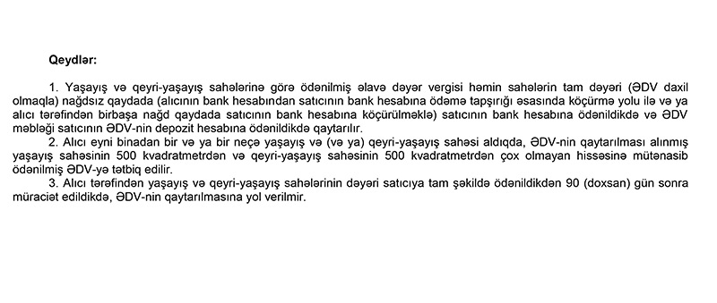 Həmçinin qeyd edilib ki, ƏDV alınmış yaşayış və qeyri-yaşayış sahələrinin dəyəri nağdsız qaydada satıcıya tam şəkildə ödənildiyi halda qaytarılır. Yaşayış və qeyri-yaşayış sahələrinin təqdim edilməsi üçün hissə-hissə ödəniş edilərsə, ƏDV yaşayış və qeyri-yaşayış sahələrinin tam dəyəri nağdsız qaydada ödənildikdən sonra müvəkkil bank tərəfindən alıcının bank hesabına köçürülür.