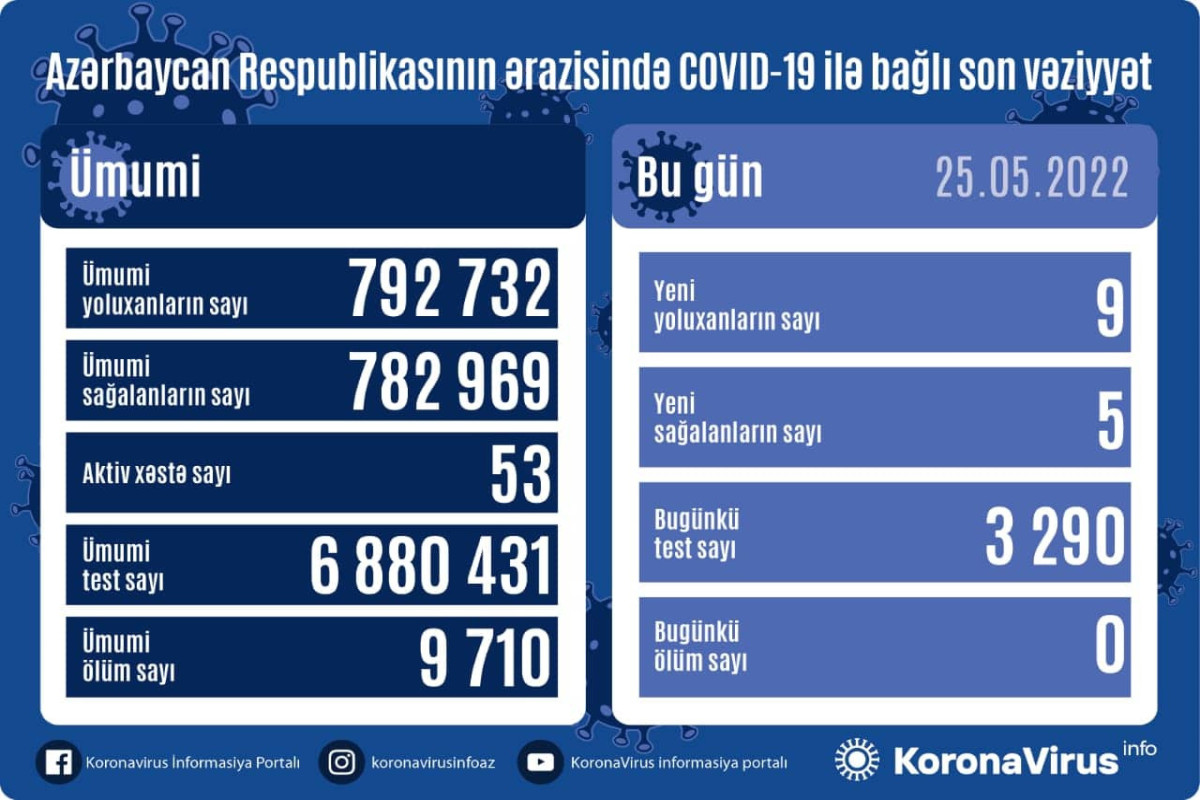 Azərbaycan Respublikasında koronavirus (COVID-19) infeksiyasına 9 yeni yoluxma faktı qeydə alınıb, 5 nəfər müalicə olunaraq sağalıb.