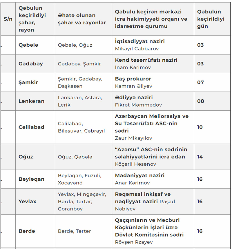 Mərkəzi icra hakimiyyəti orqanlarının və digər idarəetmə qurumlarının rəhbərləri tərəfindən 2022-ci ilin iyun ayında şəhər və rayonlarda keçiriləcək vətəndaşların qəbulu cədvəli açıqlanıb.